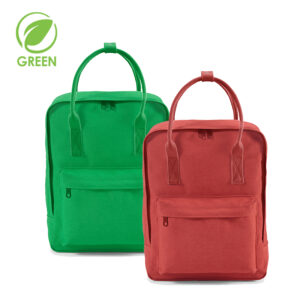 Zaino in tela di cotone riciclato (450 g/mq) da 18 litri. È dotato di due maniglie posizionate per una maggiore comodità e di spallacci in rPET. Dispone inoltre di una tasca frontale. Confezionato in un sacchetto di polietilene riciclato.