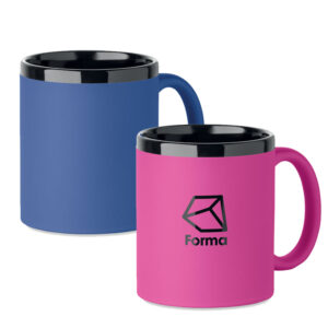 Tazza in ceramica con rivestimento soft touch e bordo interno nero. per il laser. confezionata singolarmente in scatola di cartone bianca.
