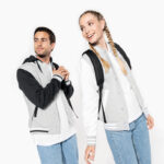 Giubbotto unisex in felpa stile college, con o senza cappuccio, con maniche e profili in contrasto. Maniche a giro a contrasto. Collo, maniche e fondo capo a costine con 2 bordini rigati a contrasto. 2 tasche a filetto sul davanti. Nastrino di rinforzo con motivo spigato e asola per appendere il capo all’interno del collo.