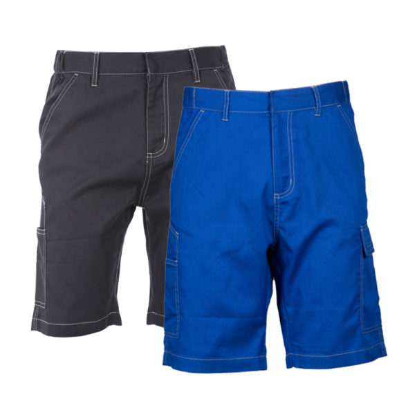 Pantalone corto multitasche con cuciture in contrasto, elastici in vita sui fianchi, due tasche anteriori, una tasca laterale chiudibile con velcro, doppia tasca laterale portautensili o portametro, una tasca posteriore con bottone, bottone automatico in vita coperto. Nessun elemento graffiante.