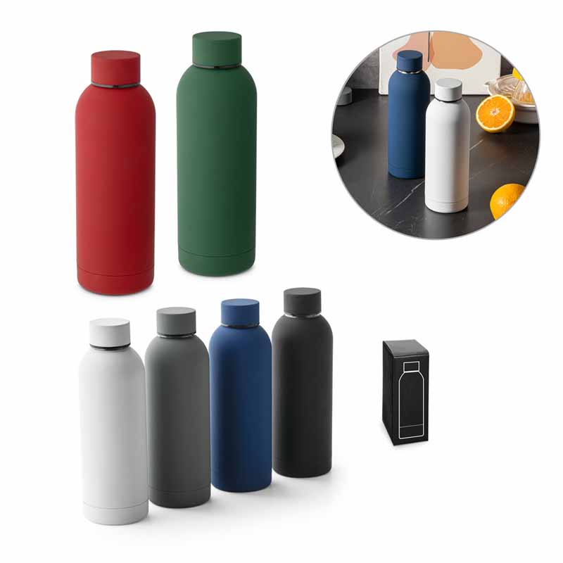 Bottiglia in acciaio inossidabile (metalizzata riciclata al 90% opaca riciclata al 36%) con tappo in acciaio inossidabile. Finitura metallizzata/opaca (colore bianco disponibile solo opaco) e doppia parete isolata sottovuoto. Capacità fino a 550 mL. Fornita in una scatola regalo in carta kraft.