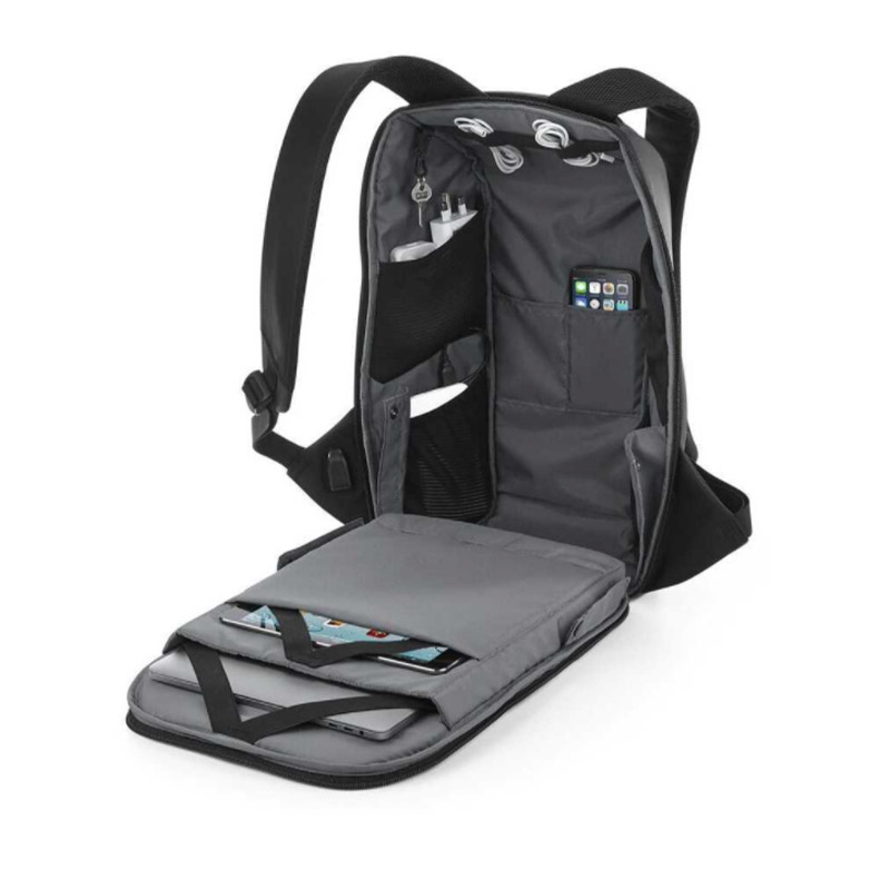 Zaino con tasca principale con apertura nascosta, stile minimal, scomparto per laptop fino a 15,6″ imbottito, tasca con cerniera nascosta nel pannello sul retro, diverse tasche interne, porta di ricarica USB integrata. Realizzato in 100% combinazione di poliestere rivestito in nylon Jacquard/PU. Capacità: 15 litri