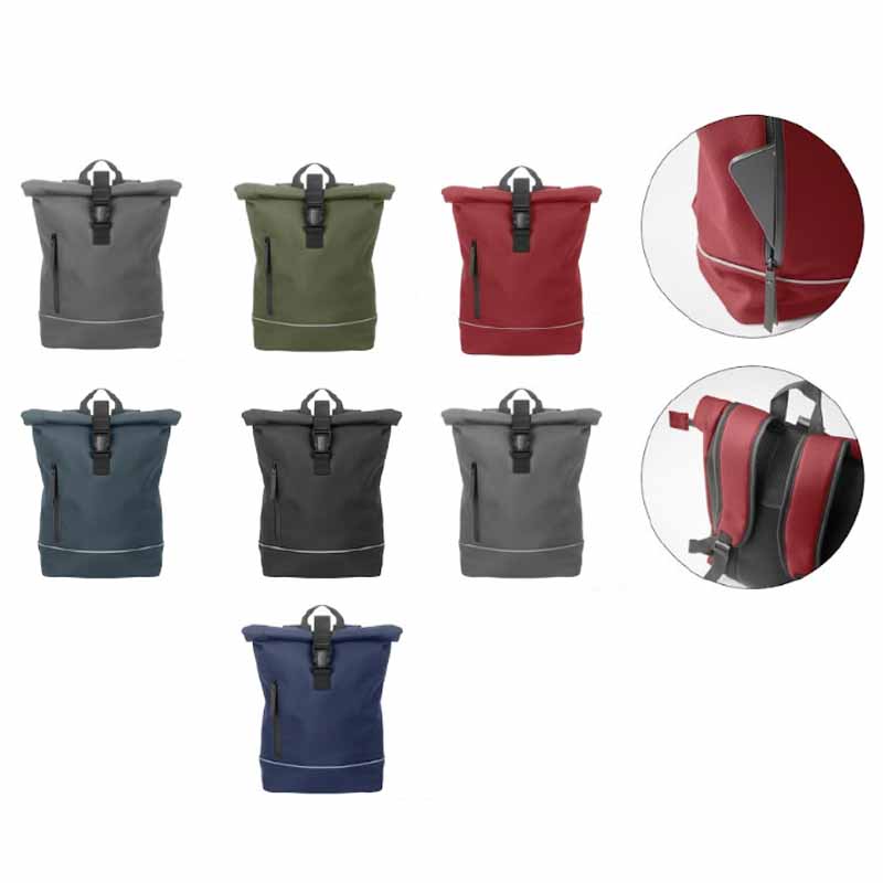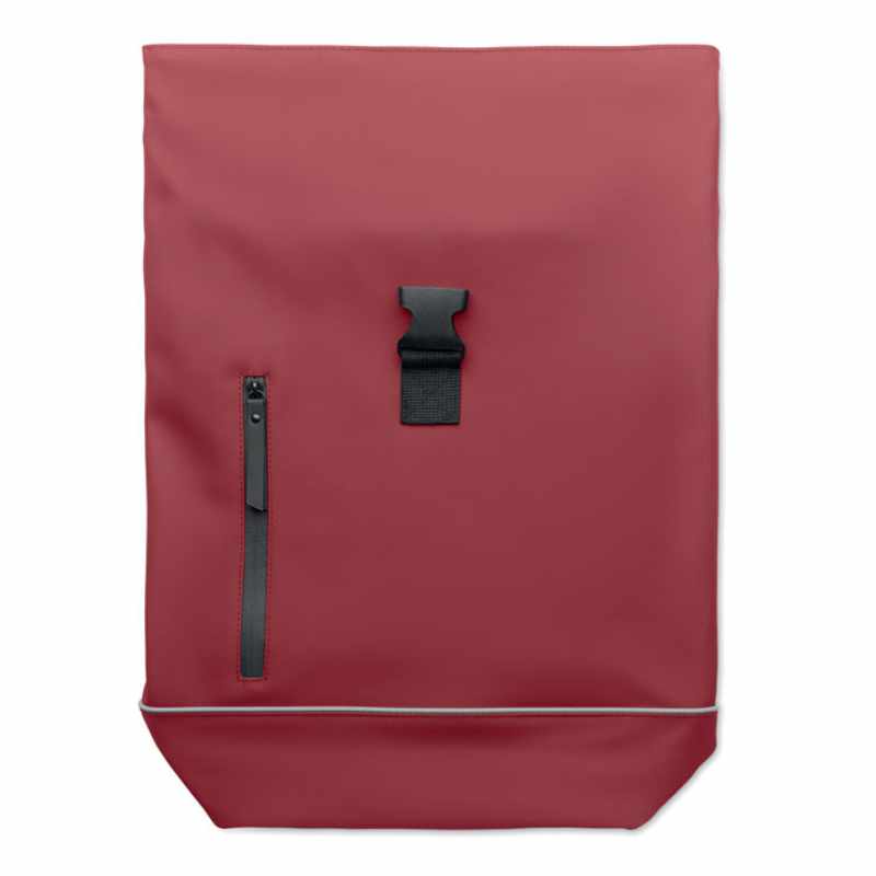 Zaino rolltop per laptop da 15 pollici in morbido PU con schienale imbottito e rinforzo alla base con striscia riflettente. Tasca frontale impermeabile con cerniera. Fodera in poliestere 210D RPET.