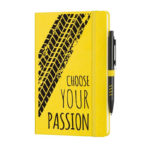 Notebook con elastico e portapenna in tinta, copertina rigida perfetta per essere pesonalizzata con embossing. 256 pagine (128 fogli) a righe, ultima pagina con tasca, 8 fogli staccabili.