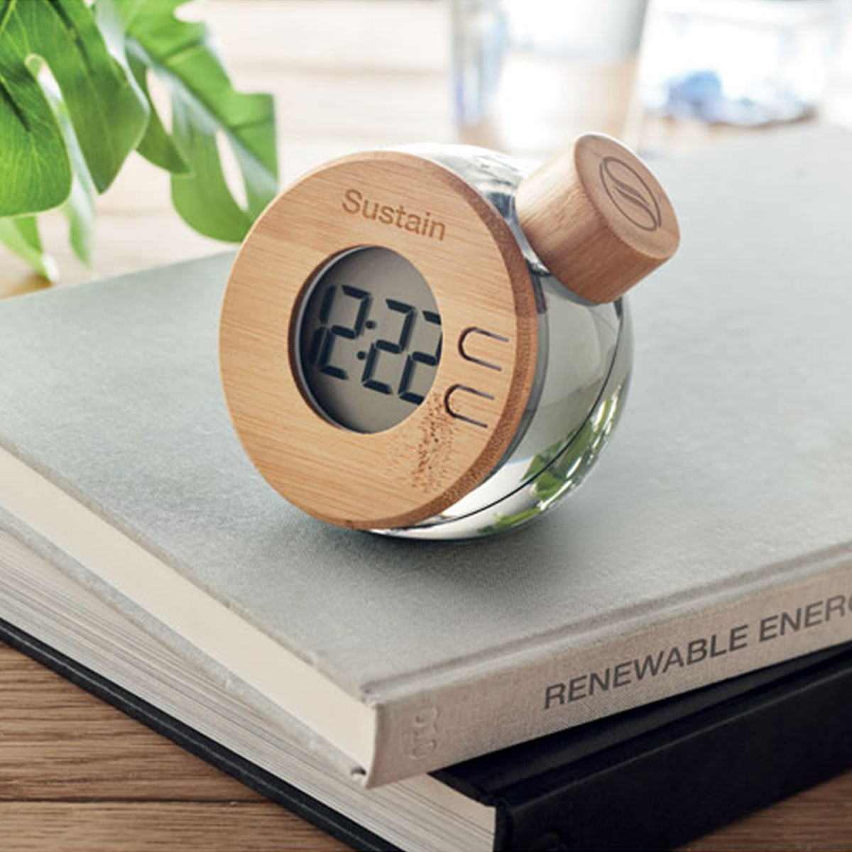 Orologio LCD con grande display e dettagli in bambù. Per alimentare questo prodotto è sufficiente aggiungere acqua e 3gr di sale. 1 batteria LR41 inclusa a scopo di memoria. Il bambù è un prodotto naturale, pertanto possono verificarsi lievi variazioni di colore e dimensioni per ciascun articolo, che possono influire sul risultato finale della personalizzazione.