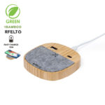 Caricatore wireless realizzato in bamboo e feltro RPET. Funzione di ricarica di 15W e compatibile con i dispositivi dotati di tecnologia Qi. Include 2 uscite per la ricarica di più dispositivi: 1 uscita USB e 1 uscita Type-C. Con etichetta RPET.