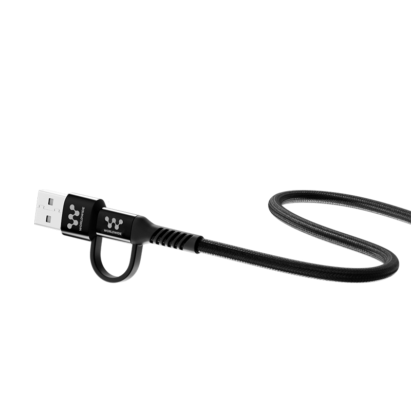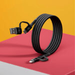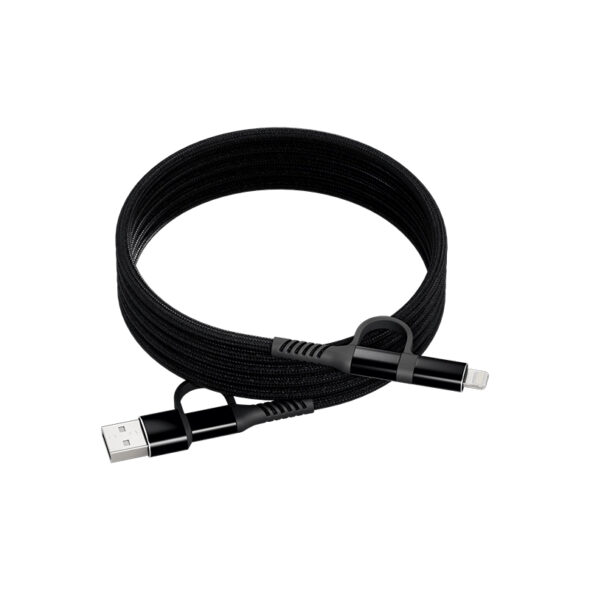 Cavo magnetico 4in1 in nylon intrecciato per la ricarica e trasferimento dati. Presenta 2 doppi connettori: da un lato USB-A e Type-C e dall’altro Lightning e Type C. Questo prodotto ha una potenza massima di 20W e portata massima di 3A. Inoltre, il cavo è compatibile con la ricarica rapida Power Delivery fino a 60W.