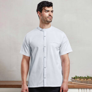 Completo da chef in tessuto riciclato, giacca a maniche corte con cinque bottoni automatici, colletto alla coreana con singolo bottone automatico, colore tinta unita a contrasto all’interno del colletto, dettaglio della tasca lato cuore. Pantaloni cargo da chef in tessuto policotone riciclato, con vita elasticizzata e coulisse, finta patta con cucitura, molteplici tasche, taglio affusolato nella parte inferiore della gamba con orlo risvoltabile.